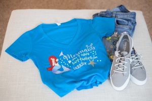 The name of the company is rooted in a cherished family experience. During a seaside trip, her granddaughter, Demi, was cautioned by her grandfather against putting something from the ocean into her mouth, citing concerns about “fish poop, whale poop and mermaid poop”. In a moment that encapsulated the innocence and imagination of childhood, Demi responded with the unforgettable remark, “Mermaids don’t have buttholes!” This memorable exchange became the inspiration behind the company’s name, symbolizing the blend of creativity, humor, and familial connection that defines Jenn’s work. A tee was immediately created and the rest is, as they say, history.